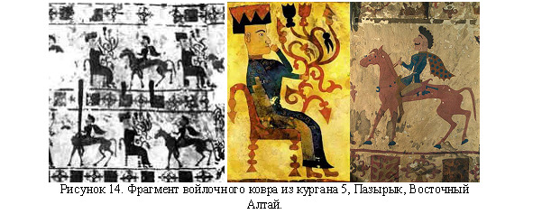 Период, когда на Алтае и в Таримской котловине господствовали юэчжи, вошел в историю Китая как период «Весны и Осени» (Чунь-цю). На территории среднего и нижнего течения Хуанхэ и на Великой Китайской равнине в то время существовало около 200 удельных княжеств. Формально лидерство на севере принадлежало царству Восточное Чжоу. На северо-западе «цивилизованного» мира обитали племена жунов – своего рода «азиатские киммерийцы». Жуны, так же как их европейские «коллеги» по своему хозяйственному укладу занимали промежуточное положение между степными номадами и пойменными земледельцами юга. Часть жунских племен еще со времен полулегендарной эпохи Ся24 породнилась с местными земледельцами и к тому времени уже имели свои удельные княжества, входившие в сферу влияния «царства» Чжоу. К середине VII века до нашей эры князья одного из «цивилизованных» жунских княжеств смогли объединить вокруг себя довольно большие земли, заслужив признание в качестве «первого среди равных» чжоуских удельных князей. В Китайских летописях они известны как династия Цинь. Именно они, скорей всего через соседние жунские племена, вступили в контакт с новыми властителями кочевого мира. К счастью, до нас дошло изображение этого контакта (рис. 14). Благодаря найденному в пазырыкском кургане №5 войлочному ковру, мы можем рассмотреть все детали одежды как царского скифа, так и циньского князя, своеобразный головной убор которого, с прямоугольной задней частью, можно увидеть и на некоторых терракотовых воинах из гробницы Цинь Шихуана25. Если предположить, что перед нами не рядовое событие, а именно первый контакт между правителями двух держав, о чем говорит и сам многократно повторенный узор и место находки ковра, то вполне вероятно, что в этом кургане похоронен скифский хакан Мадий26 (Мадай), при котором, согласно Геродоту, «в течение двадцати восьми лет, скифы властвовали над Азией, и за это время они, преисполненные наглости и презрения, все опустошили». Тогда сидящий на троне сановник – прямой предок Цинь Шихуанди, Циньский князь Жэнь-хао27, вошедший в летописи под прозвищем Мугун (Величественный князь), который в середине VII века до нашей эры расширил свои владения далеко на запад.