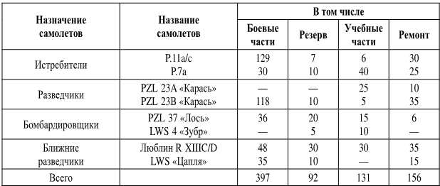 Все 397 самолетов польской военной авиации первой линии были поделены между ставкой Верховного командования и армейскими группировками. В непосредственное подчинение Генштаба перешли вновь сформированные истребительная (44 – P.11 и 10 – P.7a) и бомбардировочная (36 самолетов PZL‐37 «Лось» и 50 – PZL‐23 «Карась») бригады. Сухопутные армии «Поможе», «Познань», «Лодзь» и «Краков» получили в свое распоряжение по одному дивизиону истребителей, по одной разведывательной эскадрилье, по две эскадрильи ближних разведчиков, одному звену связных самолетов и по одной роте привязных аэростатов. Армия «Модлин» на севере и отдельная оперативная группа «Нарев» имели в своем составе по одной истребительной эскадрилье, одной – разведывательной, одной – ближних разведчиков, а также по одному звену связи и общим числом три роты аэростатов (2 – в армии «Модлин», 1 – в ООГ). Южная армия «Карпаты» располагала лишь одной эскадрильей разведчиков и одной – истребителей.