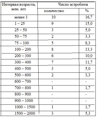 Большинство этих структур имеют фанерозойский возраст и только 7 крупных астроблем являются более древними образованиями. Распределены все найденные в настоящее время 136 кратеров по земному шару очень неравномерно. Это связано с плохой изученностью всех районов Земли (особенно тайги и джунглей). Наиболее изучены 46 кратеров в США и Канаде. 37 кратеров находятся в бывшем СССР, из них третий по величине (Попигайский). Пока еще очень плохо обследовались Африканский, Азиатский и Южно – Американский континенты. Для 60 астроблем установлено время их образования. Распределение астроблем по возрасту показывает характерную картину: 16,7 % – четвертичных, 23,3 % – кайнозойских, 21,6 % мезозойских, 30,0 % – палеозойских, по 1,7 % – вендских, поздне – и раннепротерозойских, 3,5 % – средне – протерозойских. Средние размеры всех астероидов, падавших на Землю равны: диаметр – 5,7 километров, масса – 4 х 1017 грамм, энергия – 2 х 1033 Джоулей. Кратер, который образуется от падения такого астероида среднего размера, имеет диаметр около 30 километров. Из 25 перечисленных в таблице 1 астроблем только одна (Монтанэ) расположена на шельфе и ни одной – на дне Мирового океана, в то время как океанический тип земной коры (дно океанов) занимает 58,8 % поверхности Земли. Конечно, метеориты падают и в Мировой океан, вызывая нарушения экосистем и биосферы, но обнаружить их в океане крайне затруднительно. Что касается домеловых астроблем, то здесь еще непочатый край работы (с точностью ±3 миллионов лет установлены лишь 4 астроблемы). Выпадение их на Землю совпадает с началом геологических веков.