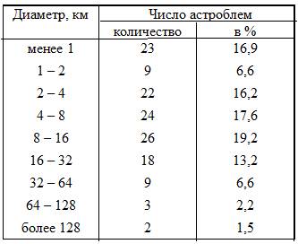 Как видно, из таблицы 1, на Земле в период 600-1500 миллионов лет астроблемы не оставили следов в связи с высокими параметрами атмосферы. Наиболее распространены сравнительно небольшие метеоритные кратеры диаметром 4 – 16 километров, составляющие 36,8 %. Крупных кратеров (16 – 64 километров) около 20 % общего количества. Астроблем – гигантов (более 64 километров) – всего 3,7 %. Аномально высокое (17 %) количество мелких (до 1 километра) кратеров объясняется тем, что это в огромном большинстве четвертичные образования.