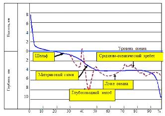 Рис. 15. Гипсографическая кривая (сплошная линия) и обобщённый профиль дна