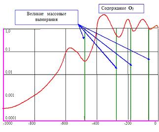 Рис. 16. Изменение содержания кислорода в атмосфере из-за быстрого наступления потопа. Великие массовые вымирания животного мира