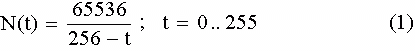 Здесь N(t) – численность носителей в клаттерах (один клаттер содержит 65536 носителей), а t – время в циклах τ (τ = 40 лет) от начала неолита. Моменты времени t = 0, 128, 192, 224, 240, 248, 252, 254, 255 – даты, когда сеть достигает гармонической стадии своего роста. (Продолжительность восьми исторических периодов, соответственно: 128τ, 64τ, 32τ, 16τ, 8τ, 4τ, 2τ, т.) Момент t = 256 – точка сингулярности или время окончания первого цикла глобального демографического перехода, если отсчет времени вести от начала неолита.