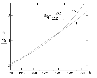 Рис. 4. Гипербола (4) и интерполяция демографических данных за 1960–1990 гг.