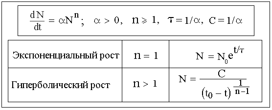 * * *Если сравнивать законы экспоненциального и гиперболического роста популяции с точки зрения характерных масштабов времени и численности, то необходимо отметить, что независимо от их каузальной интерпретации, закон экспоненциального роста содержит «встроенный» в этот закон масштаб времени, но не содержит никакого «встроенного» в него масштаба численности.