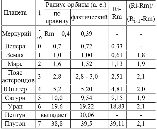 Правило Тициуса–Боде представляет собой эмпирическую формулу, приблизительно описывающую расстояния между планетами Солнечной системы и Солнцем (средние радиусы орбит). Эта формула говорит о том, что расстояния между орбитами планет и орбитой ближайшего к Солнцу Меркурия – возрастают по закону геометрической прогрессии со знаменателем примерно равным двойке (Нептун выпадает).