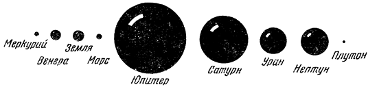 Рис 2. Планеты Солнечной системы. Изображены шариками одинаковой плотности. Диаметр Солнца на этой диаграмме должен быть в 10 раз больше диаметра Юпитера.
