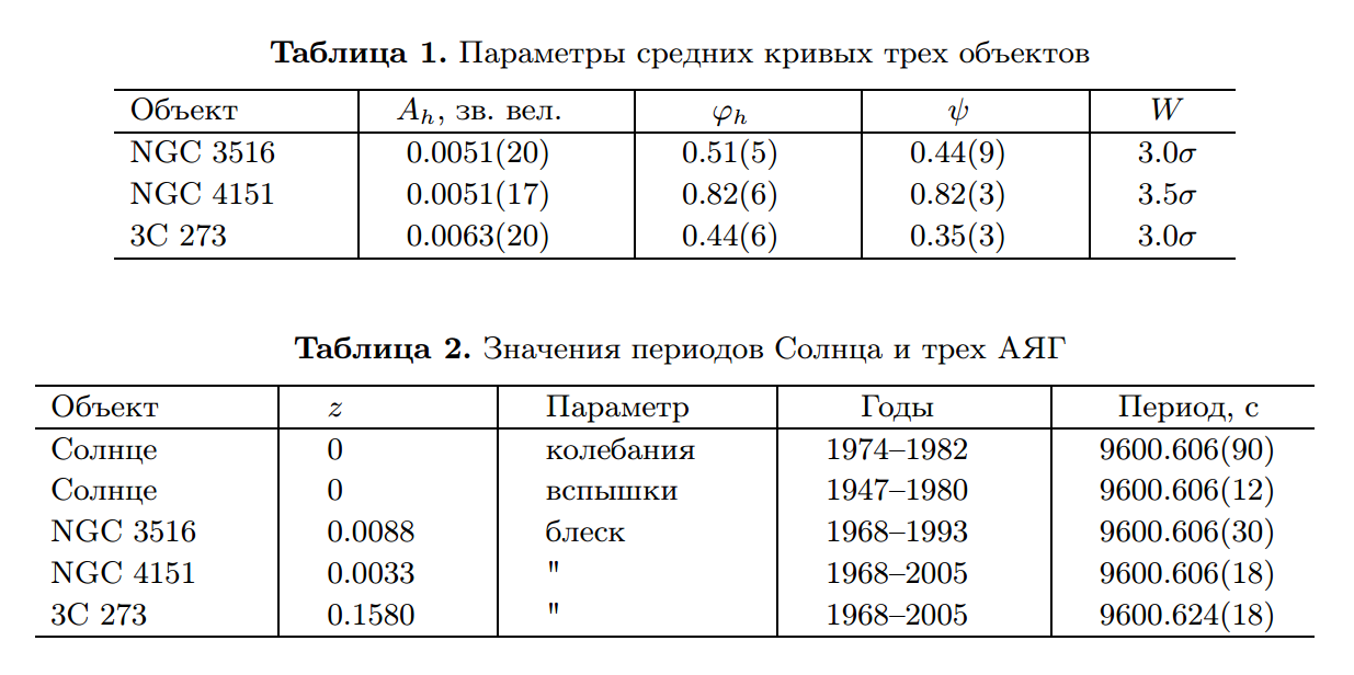 Колебания яркости квазаров в таблице 1 происходят синхронно: либо в фазе, либо в антифазе; у квазаров NGC 3516 и 3C273 – в фазе, а по отношению к NG 4151– в антифазе. Кроме того, амплитуды колебаний у всех трех объектов почти не отличаются, можно даже предположить, учитывая разброс данных, что они совершенно одинаковы. Процессы совершенно разной природы: колебания Солнечной фотосферы, вспышки на Солнце, блеск квазаров происходят в одном и том же ритме с периодом 160 минут (9600 с) – таблица 2.