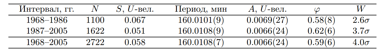 Таблица 4. Независящие от времени период, амплитуда и фаза PG колебаний блеска квазара NGC 4151 за 38 лет наблюдений: период PG = 160.0108(7) мин, амплитуда A = 0.0066(24) U-вел., фаза φ = 0.59(6).