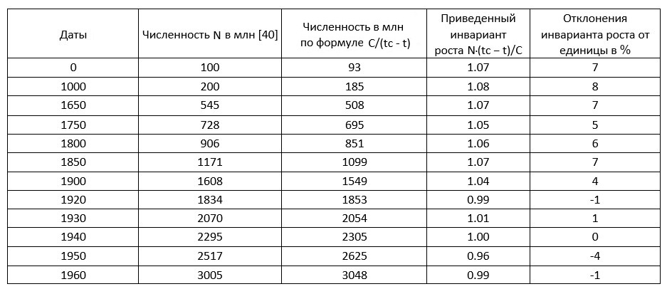 Из таблицы 1 видно, что отклонения приведенного инварианта роста от единицы за последние две тысячи лет не превосходят восьми процентов. Следовательно, можно говорить о том, что рост населения Земли от начала новой эры до шестидесятого года прошлого столетия с хорошей точностью был гиперболическим.