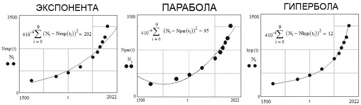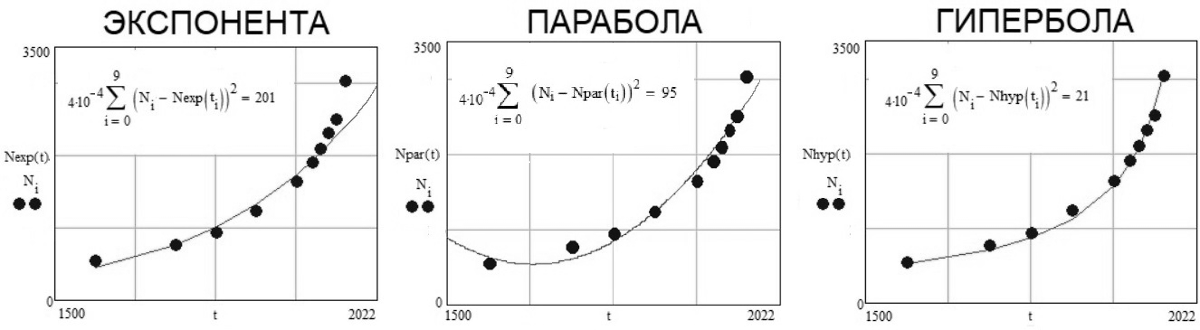 Рис. 3. Экспонента, парабола и гипербола, наилучшим образом отвечающие усредненным данным по населению мира за последние триста лет, взятым из разных источников.