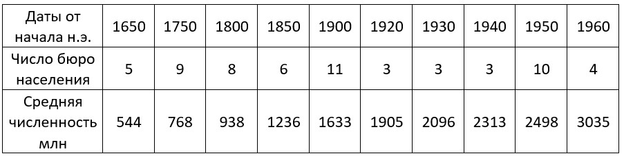 Таблица 2. Усредненные данные по численности населения Земли в млн по разным бюро населения[182].
