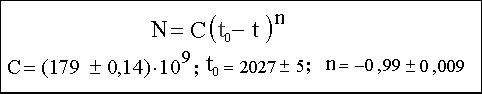 Рис. 2. Результаты обработки Фёрстером демографических данных за две тысячи лет. Точность показателя степенной функции 1 %, точность в определении даты сингулярности 5 лет.