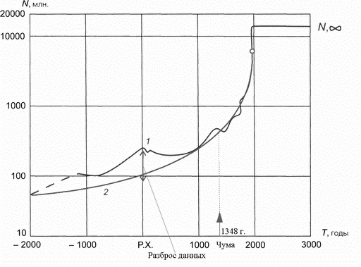 В средние века до тридцати процентов населения Европы вымерло от чумы, причем эпидемия длилась десятилетиями, а общие потери оцениваются в 25 млн или около 10 % населения мира. Этот отход от гиперболы очень хорошо виден на кривой роста численности мира по Бирабену.