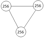 Рис. 10. ИС ранга 3, размером в три клаттера, вес каждого равен 256, число носителей 256·3 = 768. (Клаттеры для наглядности связаны непосредственно, а не через магистральный узел.)