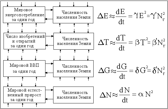 Провозглашение принципа демографического императива или гипотезы синхронного гиперболического роста показателей глобального развития не освобождает еще от необходимости давать объяснение пакету законов на рис. 1. Должен существовать причинный закон, полностью объясняющий парадоксальную независимость важнейших показателей роста и развития от ресурсов.
