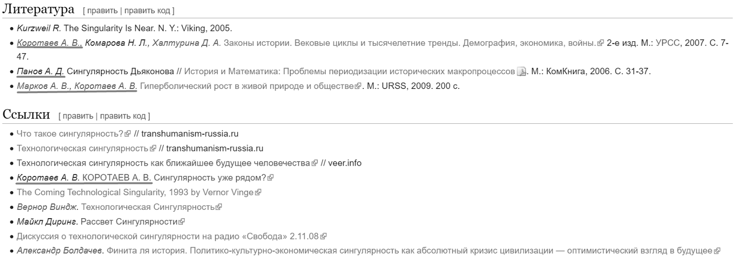 Можно только удивляться удивлению Коротаева, его безграмотности не только в математическом, но и в историческом, и в философском смысле. Хуже всего то, что, используя имеющиеся у него связи, он распространяет свои далекие от науки теории в печати и в Интернете. Так, на странице «Технологическая сингулярность» в Википедии Коротаев впечатал в ссылках себя любимого жирным шрифтом и заглавными буквами, рис. 5. Там же отметились и другие члены коротаевской корпорации: А.Д. Панов и А.В. Марков. Кто бы вычистил Коротаева и его друзей из Википедии!