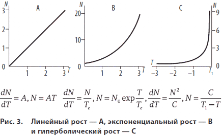 Рис. 3. Графики линейного, экспоненциального и гиперболического роста в работах С.П. Капицы.