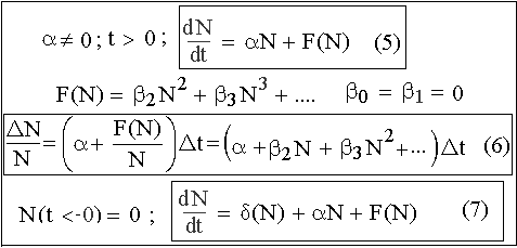 2. Если отбросить линейный член αN, оставить только F(N) и считать, например, что F(N) = βiNi, βj = 0, j ≠ i, т. е. все члены разложения кроме одного равны нулю, как в уравнении Капицы, то получаем причинный закон степенного роста, согласно которому, как мы показали ранее, не растет ни одна популяция в природе. Если же в разложении F(N) присутствует более одного члена, а функция F(N) является монотонной, то и в этом случае можно показать, что рост будет аналогичен степенному со всеми теми противоречиями, которые были рассмотрены нами ранее.