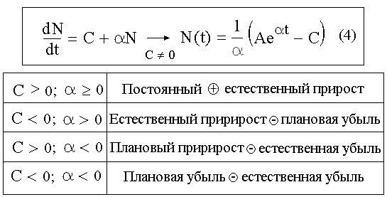 Если же оставить линейный член плюс константа от нелинейного – получим простейшее линейное неоднородное дифференциальное уравнение первого порядка с постоянными коэффициентами. В зависимости от знаков С и α возможны четыре варианта роста численности.
