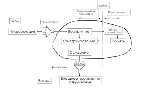 Пройденная через фильтрующего «швейцара» информация воспринимается и находится некоторое время в кратковременной памяти. Мозг вновь поступившую информацию сопоставляет с информацией, которая есть у нас в долговременной памяти, перерабатывает и возвращает в сознательную область уже в видоизмененном состоянии. Далее формируется некое суждение, решение, умозаключение. Это суждение либо озвучивается (слово – серебро), либо придерживается на потом (молчание – золото).