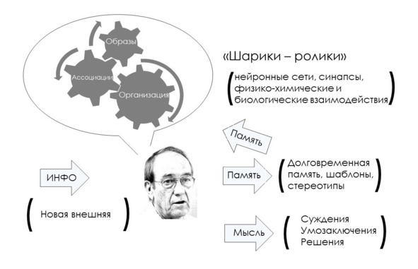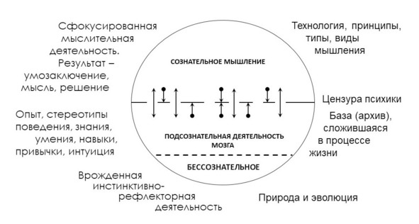 В верхней части рисунка показано сознательное мышление (вернее осознанное, сфокусированное), которое рождает некое умозаключение, решение. Это то медленное мышление, о котором было сказано выше. При этом использует различные виды и типы мышления, например логику или системный подход. Это первый, видимый уровень мышления. Однако сознательная деятельность постоянно обращается к своему подсознанию, вытаскивая оттуда требуемые для решения данные, факты, знания, аналогии из прошлой жизни. Сознательные размышления постоянно как бы подпитываются из подсознания. Работу подсознания в этом случае можно условно сравнить с работой файла подкачки в компьютерах. В необходимом случае информация из долговременной памяти вмешивается в сознательное мышление.