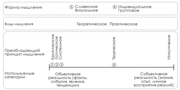 С точки зрения психологии и философии данная классификация и наименования отдельных видов и типов не безупречны. Более того, в ряде работ отдельным видам мышления отводится некая особенная, обобщающая роль. Например, в качестве таких агрегаторов предлагается критическое мышление, стратегическое мышление, дизайн-мышление и ряд других. С моей точки зрения эти подходы не являются догмой, но и приведенную классификацию не следует считать единственно верной. Однако такая классификация понятна и, самое главное, отражает основной набор хорошо известных видов, типов и форм нормального мышления.
