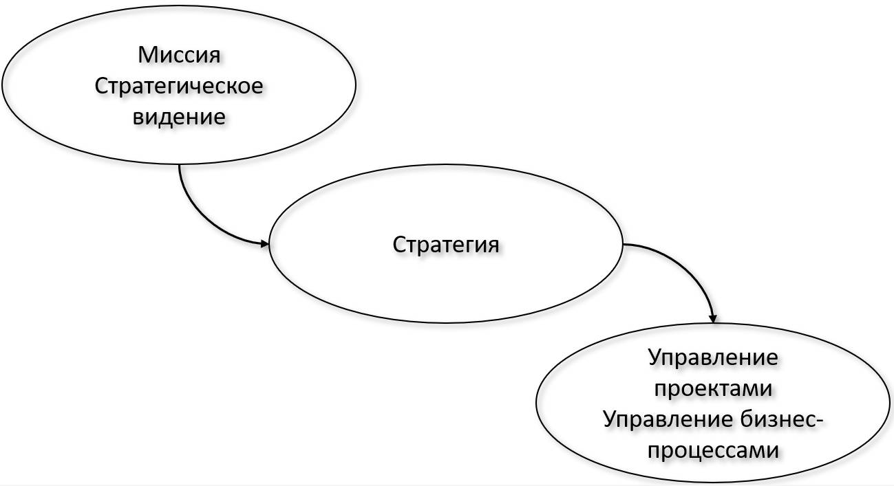Классические подходы, сформированные в рамках стратегического менеджмента, предписывают последовательное развертывание стратегии в логике нисходящего потока, начиная с уровня Миссии и Стратегического видения с дальнейшим переходом к стратегии и наконец с переходом от стратегии к операционным задачам (см. рисунок 1). В рамках такой логики смысловые и культурные установки задают вектора и ограничения для разработки стратегии, а та, в свою очередь, задает требования для операционных процессов.