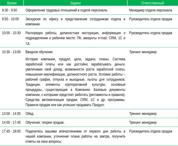 Таблица 1. Примерный план работы менеджера продаж (первый день).