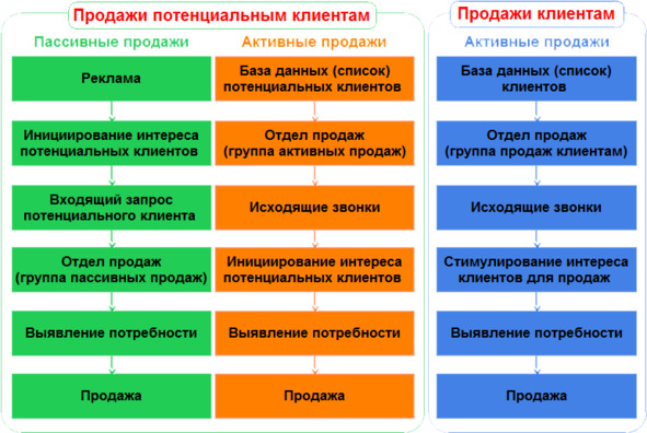 Вы будете исполнять набор функций в зависимости от вида продукта и принятой в вашей компании технологии продаж. Для увеличения продаж компании и роста вашей заработной платы, необходим постоянный прирост новых клиентов, и работа с существующей базой клиентов. Есть два основных способа привлечения клиентов, это пассивные и активные продажи. Когда компания, разрабатывая программу рекламы и продвижения, инициирует обращения потенциальных клиентов – это пассивные продажи. При этом важно контролировать эффективность рекламы и качество работы сотрудников, которые отвечают на входящие обращения. Активные продажи подразумевают создание базы потенциальных клиентов из различных источников. По этой базе осуществляется исходящий контакт – телефонный звонок или e-mail рассылка. Каждая компания самостоятельно определяет сочетание функций менеджеров отдела продаж (схема 1).