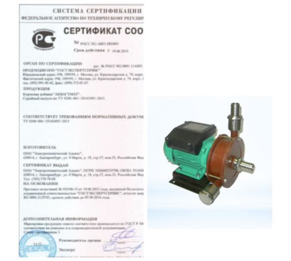Сертификат соответствия биодобавки – «Аквагумат», и аппарат производства структурированной воды – «Аквавит»
