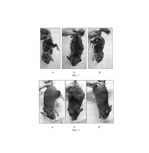 На Фиг. 1. А, Б, В представлено состояние шерстного покрова животных первой группы до начала исследования (фото). На Фиг. 2 А, Б, В представлен внешний вид животных первой группы через 3 месяца после прекращения скармливания ФМКД, мех выглядел восстановленным