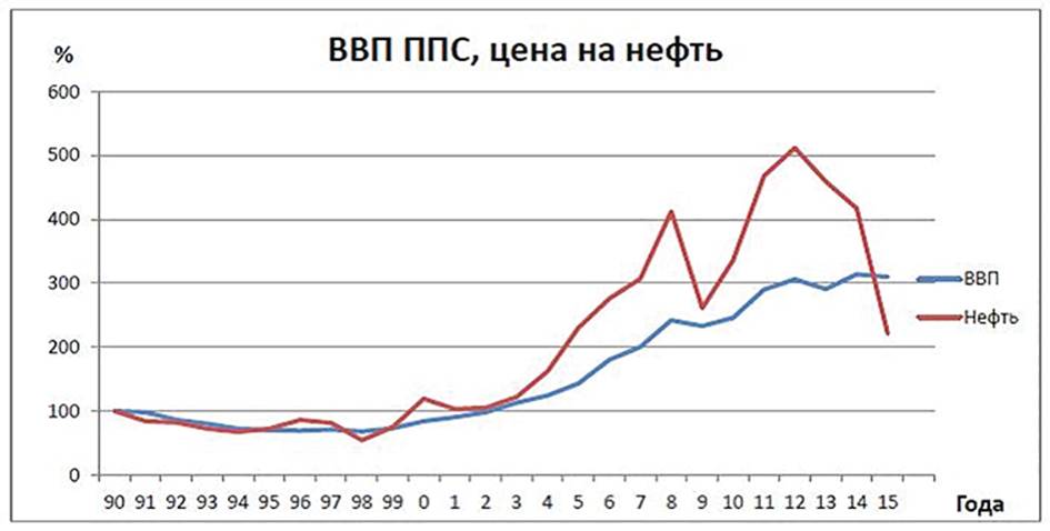 С 2000 по 2008 г. цена на нефть росла. Одновременно с ней рос ВВП. За этот период он вырос в 2,9 раза, а цена на нефть в 2,8 раза. Поскольку эти значения близки, то можно сделать вывод, что ненефтяной сектор экономики увеличил производство примерно в такое же число раз, т. е. экономика развивалась. После кризиса 2008 г. ВВП практически не изменился (хотя цена на нефть упала на 37%). Причина была в том, что год ушел на погашение долгов. С падением цены на нефть упал и курс рубля, и это превратило взятые по привлекательному проценту кредиты в иностранной валюте в долговую ловушку.