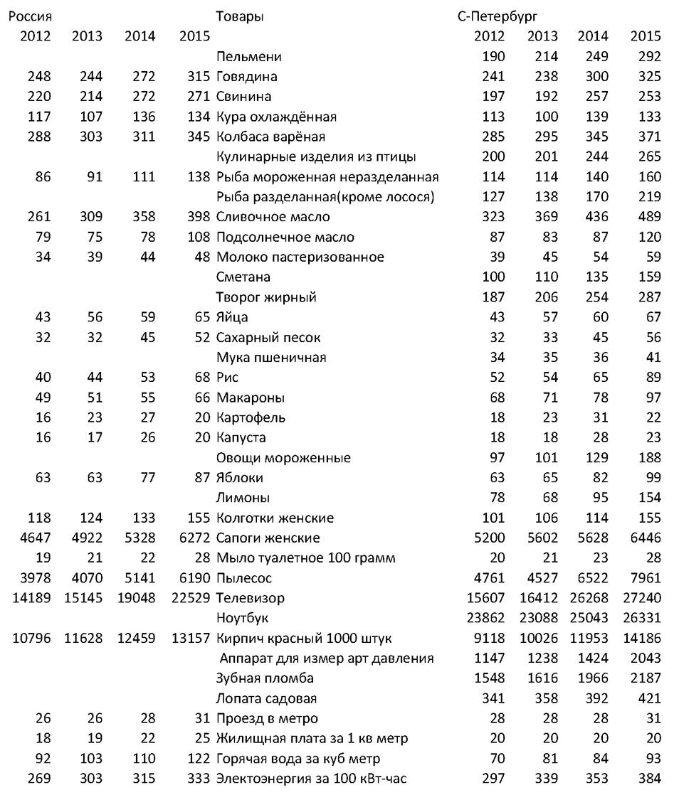 Показатель инфляции используется для коррекции пенсии и зарплат госслужащих. К сожалению, в трудные времена госструктуры искажают показатели инфляции. Покажем это на примере 2014 г. и 2015 г. Ниже приведены данные Федеральной службы государственной статистики (сайт http://www.gks.ru/ ). Индексы потребительских цен на продовольственные и непродовольственные товары показывают рост цен на эти товары в процентах. Таблица «Цены» показывает цены товаров, которые используются при расчете инфляции в рублях. Я включил в эту таблицу цены в С.-Петербурге: я сам из Петербурга, и мне легче оценивать их достоверность, на сайте Росстата по Петербургу представлен больший ассортимент, чем по России, и, наконец, цены в Петербурге близки к средним ценам в России.