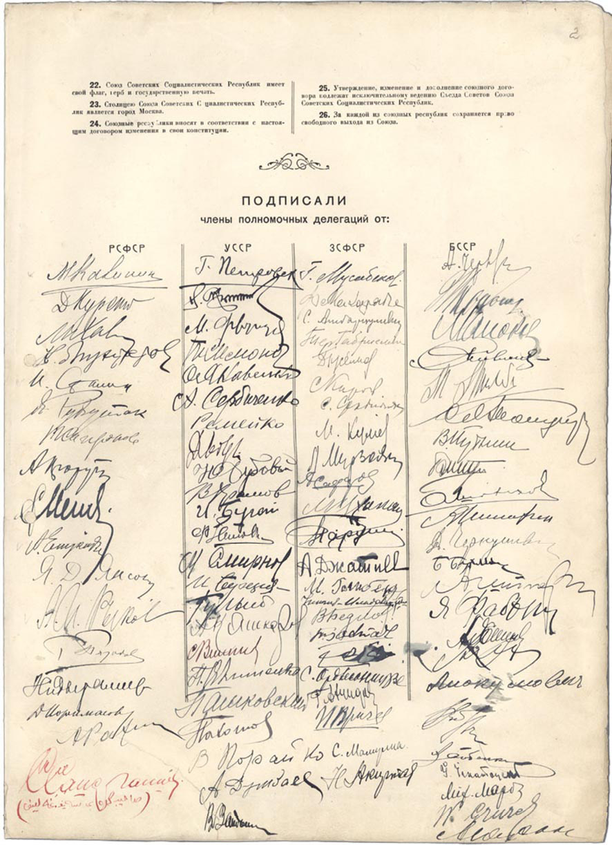 Образование СССР. В сентябре 1922 г. комиссия ЦК РКП(б) с участием И. В. Сталина подготовила так называемый «план автономизации»: вхождение советских республик в состав РСФСР на правах автономий. В. И. Ленин предложил иную юридическую базу для оформления единого государства с удержанием необходимых «атрибутов независимости»: провозгласить его как добровольный союз суверенных и равноправных республик. ЦК РКП(б) высказался за это предложение. 30 декабря 1922 г. съезд полномочных представителей РСФСР, Украины, Белоруссии и Закавказской федерации (I съезд Советов СССР) принял Декларацию и Договор об образовании Союза Советских Социалистических Республик, избрал Центральный исполнительный комитет (ЦИК). В январе 1924 г. II Всесоюзный съезд Советов одобрил Конституцию СССР. Высшим органом власти она объявила Всесоюзный съезд Советов, а между съездами – ЦИК, состоявший из двух равноправных палат: Союзного Совета и Совета Национальностей (первый избирался съездом из представителей союзных республик пропорционально их населению; во второй входили по пять представителей от каждой союзной и автономной республики и по одному – от автономных областей). Высшим исполнительным органом провозглашался Совет народных комиссаров СССР. Он ведал иностранными делами, обороной страны, внешней торговлей, путями сообщения, финансами и др. В ведении союзных республик находились внутренние дела, земледелие, просвещение, юстиция, социальное обеспечение и здравоохранение.