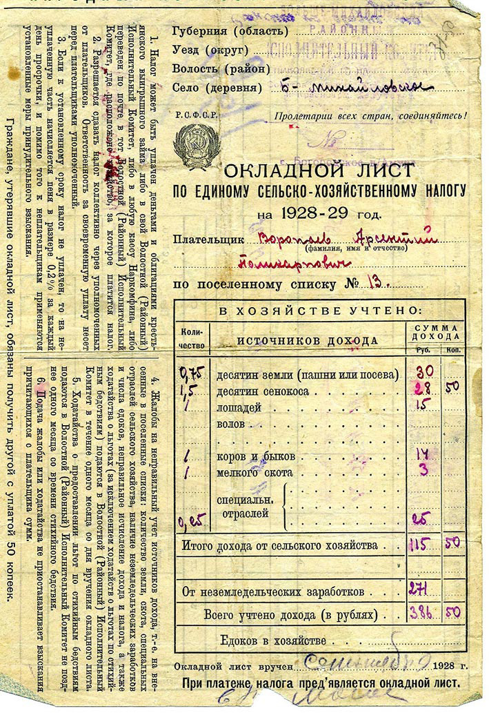 Окладной лист по единому сельскохозяйственному налогу на 1928—1929 год крестьянина села Больше-Михайловское Дальневосточного края Воропаева Арсентия Поликарповича.