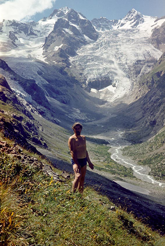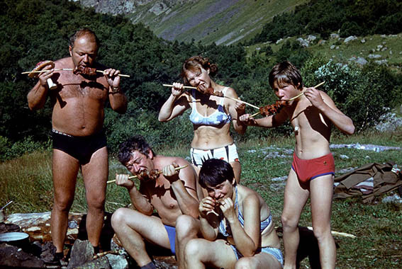 У меня почти не было отпусков. Но всё же один запомнился. Олег Д., с которым мы подружились в ТРТИ, оформил нам 3 путёвки в альплагерь в Дигории (Северная Осетия). Собралась такая компания: Олег с приятелем Аликом, Людмила, подруга Алика, сын Александр и я (порядок имён соответствует расположению на фотографиях). Мы ходили в лёгкие экскурсии, но заметили, что альпинистам дают свежее мясо. Когда мы попытались его получить, нам сказали, что нужно дать заявку на восхождение. Выше на 100 метров нашего палаточного городка была полянка с обустроенным (лежащее бревно) местом для костра. Мы оформили восхождение на гору Кругозор и отправились с группой. Остановились на этой полянке. Стали делать шашлыки и на восхождение группы уже смотрели в бинокль. Умеют делать шашлыки люди с Кавказа!