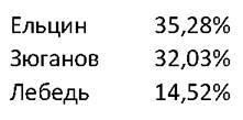 Генерал Лебедь получил столько же голосов, сколько оставшиеся восемь кандидатов вместе взятые. Унизительно выглядели 0,51% голосов Горбачева (и на что он надеялся?). Во второй тур вышли Ельцин и Зюганов. Многое (если не все) зависело от того, за кого предложит голосовать своим избирателям Лебедь. Через несколько дней после первого тура выборов Ельцин объявил о назначении А. Лебедя секретарем Совета безопасности с особыми полномочиями (через три месяца освобожден от этой должности), после чего тот появился рядом с Б. Ельциным перед телекамерами, поддержав его и фактически решив исход второго тура. По итогам второго тура выборов действующий президент России Ельцин одержал победу и был переизбран на второй срок.