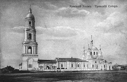 Вот ещё одно утраченное достояние России, но уже без участия фашистов – Троицкий собор в Красном Холме. От него осталась только колокольня. Красный Холм расположен вдали от железнодорожной станции. Жизнь здесь замерла. Придя на кладбище, на главной тропе обнаружил удивительную надгробную плиту. Похоронен купец – самая заметная фигура подобных городов. К сожалению, не было с собой фотоаппарата, поэтому воспроизвожу надпись по памяти.