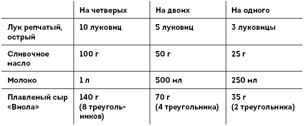 Луковый супЛуковый суп – один из известнейших в мировой кулинарии вариантов супов, предназначенный для восстановления сил, особенно при ночной работе, неумеренных развлечениях, для ослабленных больных и для лиц, лишенных аппетита, с пониженным тонусом и угнетенной нервной системой. Луковый суп в разных вариациях имеют многие народы Европы и Азии. Наиболее известен французский луковый суп, применявшийся при дворах монархов, когда развлечения затягивались за полночь. Имеется и узбекский луковый суп – ёрма, также весьма питательный (с курдючным жиром, очень калорийный) и вкусный, употребляемый лицами тяжелого физического труда. Предлагаемый вариант лукового супа сочетает европейский и азиатский подходы. Содержит расчеты продуктов на четырех человек, на две персоны и на одного едока.