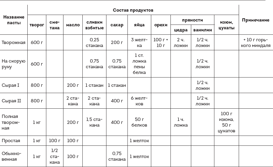 Основными продуктами в пастах являются творог, сливочное масло, сметана, сливки, сахар, яйца; дополнительными – орехи, цукаты, изюм и различные пряности (чаще всего ваниль и лимонная цедра). Творог и сахар присутствуют во всех пастах. Сливки, сметана и масло не всегда встречаются одновременно, а яйца используются еще реже – то целиком, то один желток, то отдельно белки.