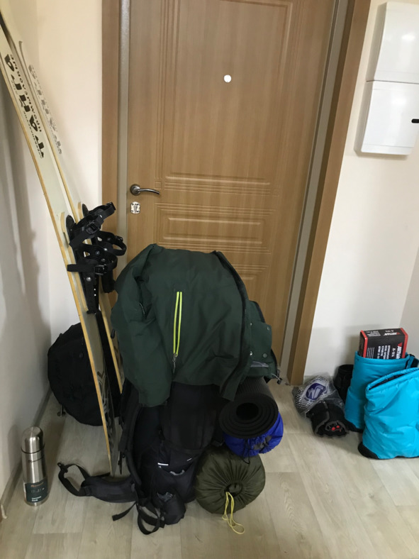 Основные необходимые вещи в походе: рюкзак 75—100 литров, обувь походная зимняя, обувь для палатки, зимняя флисовая балаклава, пуховик для стоянок, походные зимние брюки и не продуваемая зимняя куртка (с мембранами и тканью для отвода влаги, идущей от тела). Лыжи охотничьи, бахилы на обувь (не пропускают снег, а значит не дают таять снегу непосредственно на самой обуви, а значит ноги будут сухими, что очень важно при остановках и отдыхе), термоноски для сноубордистов и лыжников, горнолыжная маска, лыжные палки под свой рост, флисовые перчатки. Туристическая кружка и тарелка, ложка и вилка, сноубордические варежки, несколько слоев термобелья (флисовых свитеров и кофт), туристический коврик (лучше два), спальный мешок под предполагаемую температуру ночевки (можно два с разными температурными режимами), газовая горелка, спички, сухое горючее и т. д. Естественно для группы в целом должна быть взята с собой палатка и печка для обогрева туристов внутри палатки.