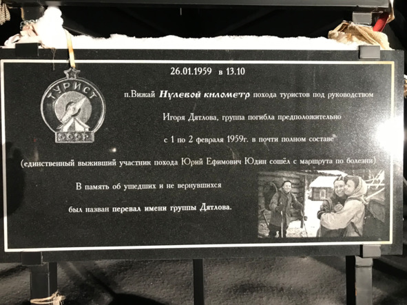 В поселке Вижай установлен памятник группе Дятлова с фотографиями членов группы и указатель направления к перевалу Дятлова, где мы сделали первые в этом походе групповые и одиночные фотографии на фоне указателя к перевалу.