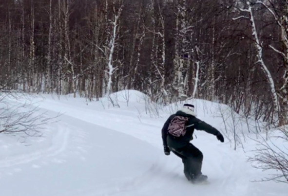 Адреналин подступал к голове, а формируемый движением тела поток воздуха создавал ощущение небольшого ветерка. Набрав скорость, я стал делать синусоидальные маневры влево-вправо, выезжая на пухляк, тем самым картинно рисуя красоту спуска, но и в то же время снижая свою скорость.