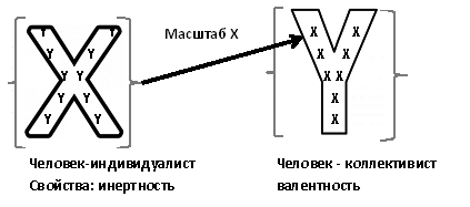 Свойства. Физически человек выступает как ХУ-субстанция. Социально-психологически может выступать и как Х-доминирование (индивидуализм), и как Y-доминирование (коллективизм), и как ХУ-равноправность.