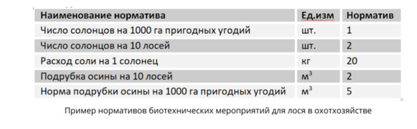 Согласно Нормативам количество солонцов для лося может составлять либо 2 шт. на 10 особей, либо 1 шт. на 1000 га угодий, пригодных для обитания вида. Таким образом, по численному показателю необходимо 237 х 2 / 10 = 47 солонцов, в то время как по площадному показателю – 53 х 1 / 1000 = 53 солонца.