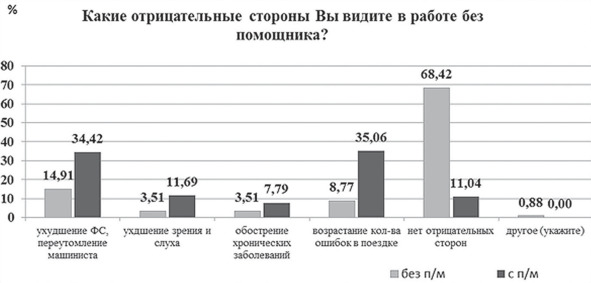 Отрицательные стороны работы без помощника также существенно различаются в двух группах респондентов. Машинисты, работающие в составе локомотивной бригады, считают, что работа без помощника чревата для машиниста возрастанием количества ошибок в поездке (35%), ухудшением функционального состояния, переутомлением (34,4%), ухудшением зрения и слуха (11,69%), обострением хронических заболеваний (7,8%). В то же время некоторые машинисты, работающие на момент анкетирования без помощника, также отмечают проблему переутомления (14,9%) и возрастания количества ошибок (8,8%), однако в большинстве своём считают, что в работе без помощника машиниста нет отрицательных сторон (68,4%).