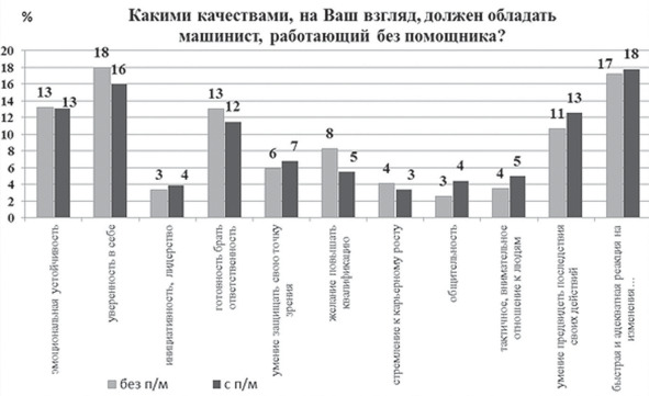 Интересен тот факт, что машинисты, работающие в составе локомотивной бригады, чаще отмечают желательным для машиниста без помощника такое качество, как общительность и тактичное, внимательное отношение к людям, в то время как машинисты, уже работающие без помощника, не демонстрируют особенной необходимости в этих качествах, предпочитая стремиться к повышению квалификации и карьерному росту. Наименее важными качествами для машиниста, работающего без помощника, были признаны инициативность, лидерство, общительность и тактичное, внимательное отношение к людям.