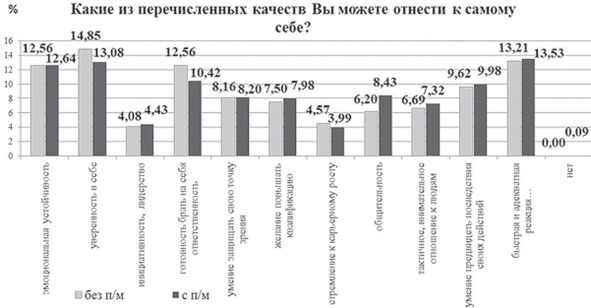 Из того же набора качеств, который был рассмотрен в предыдущем пункте, машинистам предлагалось отметить те, которыми они, на их взгляд, обладают сами. Наиболее распространёнными характеристиками стали: уверенность в себе, быстрая и адекватная реакция на изменения в окружающей обстановке, эмоциональная устойчивость, готовность брать на себя ответственность (машинисты, работающие без помощника, чаще демонстрируют это качество). Интересен тот факт, что машинисты часто признают себя общительными людьми, хотя считают, что в работе, особенно без помощника, данное качество останется невостребованным.