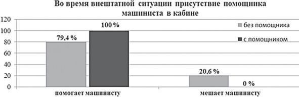 Среди машинистов, работающих в данный момент без помощника, 79,4% считают, что наличие помощника во время внештатной ситуации помогает машинисту, а 20,6% не выразили потребности в присутствии помощника. При этом 100% машинистов, работающих в составе локомотивной бригады, отмечают, что присутствие помощника при внештатных ситуациях необходимо.